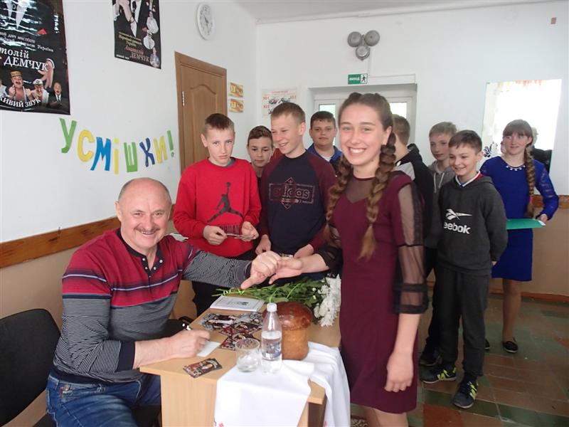 А усмішка і добра атмосфера так необхідні нам в стрімкому сучасному житті, заполонили серце кожного, хто був присутній на зустрічі. На завершення учасники зустрічі обмінялися подарунками: директор школи Серафим О.М. вручив пану Анатолію перше шкільне видання «Анатолій Демчук – гордість і слава школи» із серії «Славетні земляки – випускники школи», а Артист подарував усім листівки з автографами і побажаннями, для школи – компакт-диски із своїми концертами, і звичайно ж – фото на згадку.