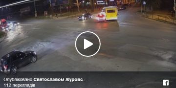 Щойно, пр. Злуки-15 Квітня. Так буває, коли з лівого ряду хочеш повернути праворуч і ще й в по дзеркалах не дивишся. Уявляю що пережили пасажири в маршрутці – пише Святослав Журовський, автор відео.