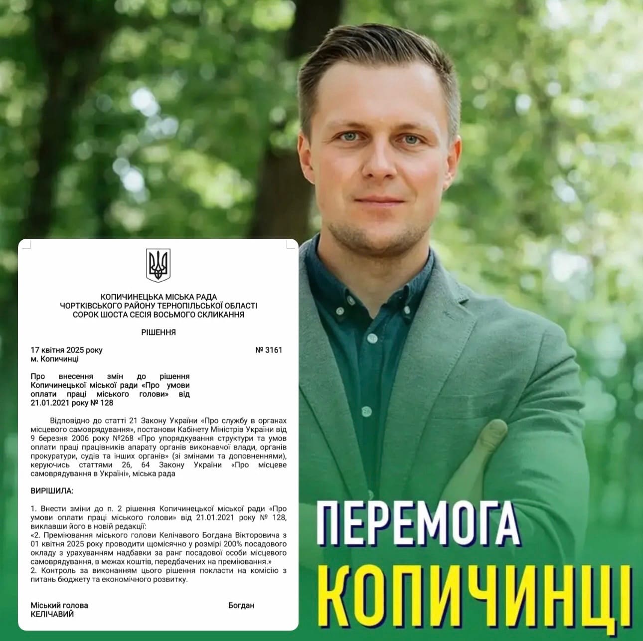 За інформацією Тернопільоблвідкат, міському голові Копичинців Богдану Келічавому з 1 квітня 2025 року встановили щомісячну премію у розмірі 200 відсотків посадового окладу з урахуванням надбавки за ранг. Фактично йдеться про дві додаткові зарплати щомісяця.