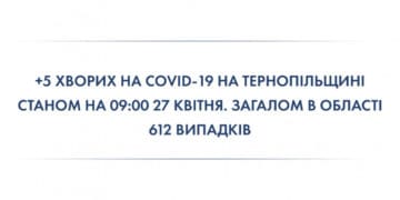 Згідно з даними обласного лабораторного центру станом на 09:00 27 квітня на Тернопільщині 612 випадків COVID-19, 10 – летальних, 70 людей одужали.