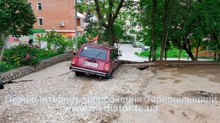 “Вчора вечері я припаркував автомобіль біля під’їзду. Йшов дощ. Сьогодні зранку приходжу, машина похилена. Думаю може колеса вкрали, а вона в ямі. Я пішов в водоканал, бо тут напередодні їхні працівники ремонтували труби, там сказали чекати передзвонять”, – каже власник пошкодженого авто Тарас.