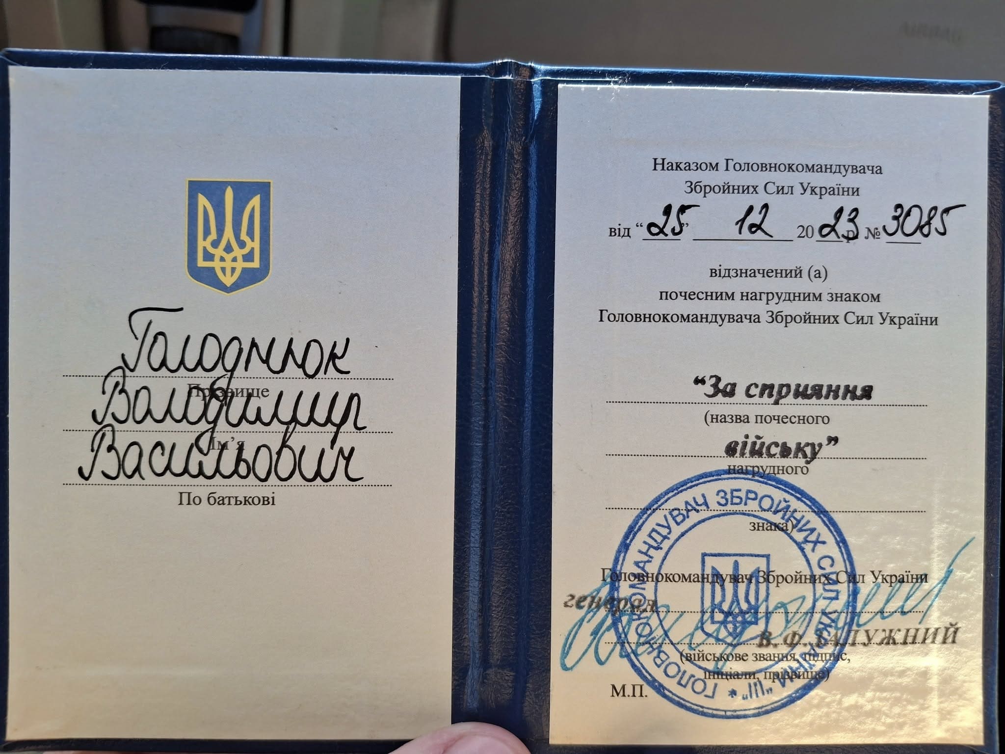 Нагороду Володимиру Голоднюку вручив Вадим Сухаревський з позивним “Борсук”.