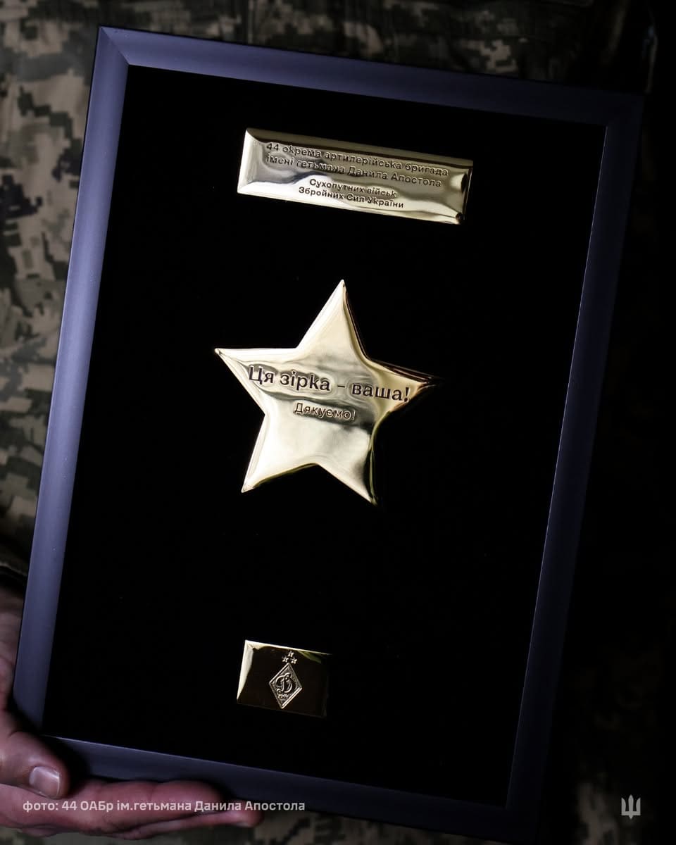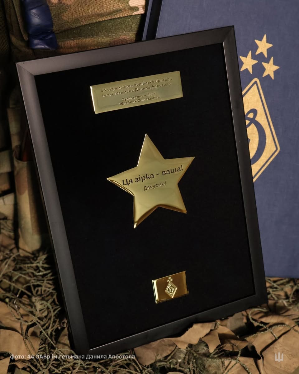 Військовослужбовці 44 окремої артилерійської бригади імені гетьмана Данила Апостола отримали подяку від футбольного клубу “Динамо” Київ. Захисникам передали золоту зірку, яка символізує 30-те чемпіонство столичного клубу та є знаком вдячності Збройним Силам України за мужність і самопожертву в умовах повномасштабної війни.