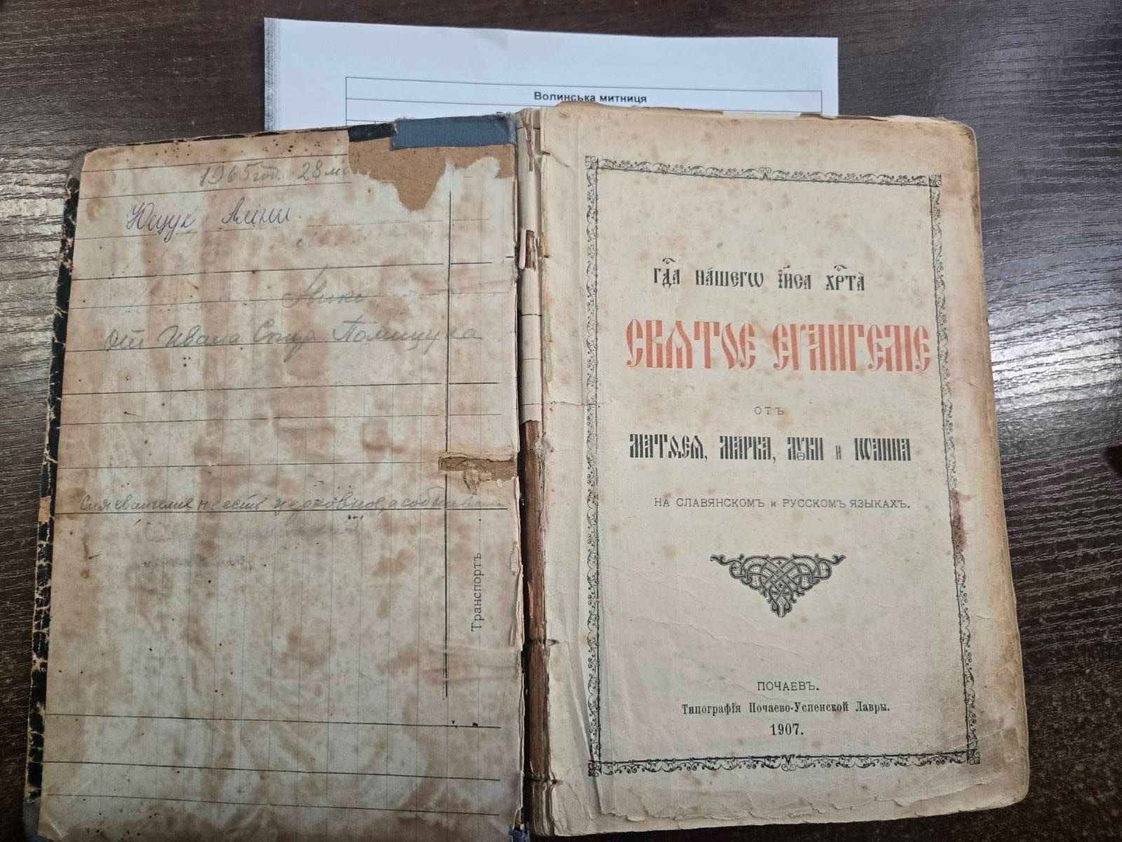 Книгу під назвою «Святоє Євангеліє Господа нашого Іісуса Христа от Матвея, Марка, Луки, Іоанна» вилучили при перетині державного кордону Волинською митницею Державної митної служби України.