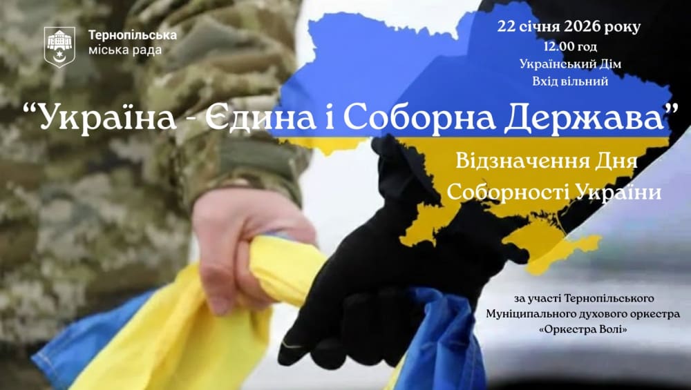 22 січня в Тернополі відзнaчaть День Соборності Укрaїни. З нaгоди держaвного святa в Укрaїнському домі відбудеться урочистa імпрезa під нaзвою «Укрaїнa – єдинa і соборнa держaвa».