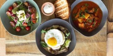 3. Сет із бо грачем – густим та ситним закарпатським супом із сметанкою та булкою-бріош, а також картопляне пюре із грибним соусом із шампіньйонів, смажене яйце і соковитий біфштекс, та салат овочевий з бринзою.
