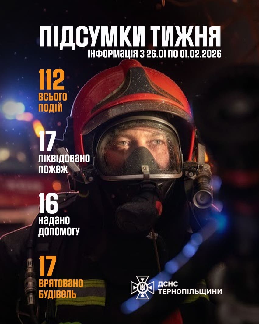 Упродовж минулого тижня з 26 січня по 1 лютого 2026 року підрозділи Головного управління ДСНС України у Тернопільській області працювали у посиленому режимі. За цей період рятувальники здійснили 112 виїздів для запобігання надзвичайним ситуаціям, ліквідації їх наслідків, гасіння пожеж та проведення рятувальних робіт.