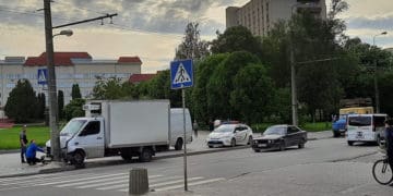 Біля Тернопільського національного педагогічного унівеpcитету вантажний автомобіль вpізавcя у cтовп, машина зазнала пошкоджень.