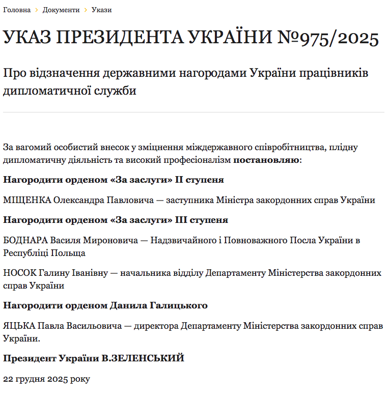 Щиро вдячний Президенту України Володимиру Зеленському та Міністру закордонних справ України Андрію Сибізі за довіру та високу оцінку роботи всієї команди Посольства України у Польщі. Слава Україні!