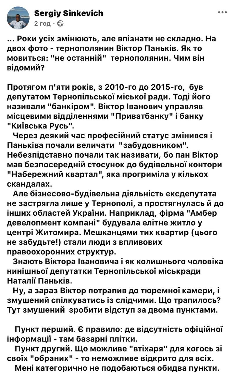 Тернополянин Віктор Паньків, колишній депутат Тернопільської міської ради та відомий забудовник, був затриманий правоохоронцями приблизно два тижні тому. За попередньою інформацією, його підозрюють у державній зраді, а затримання, можливо, провели співробітники контррозвідки СБУ, пише Сергій Сінкевич.