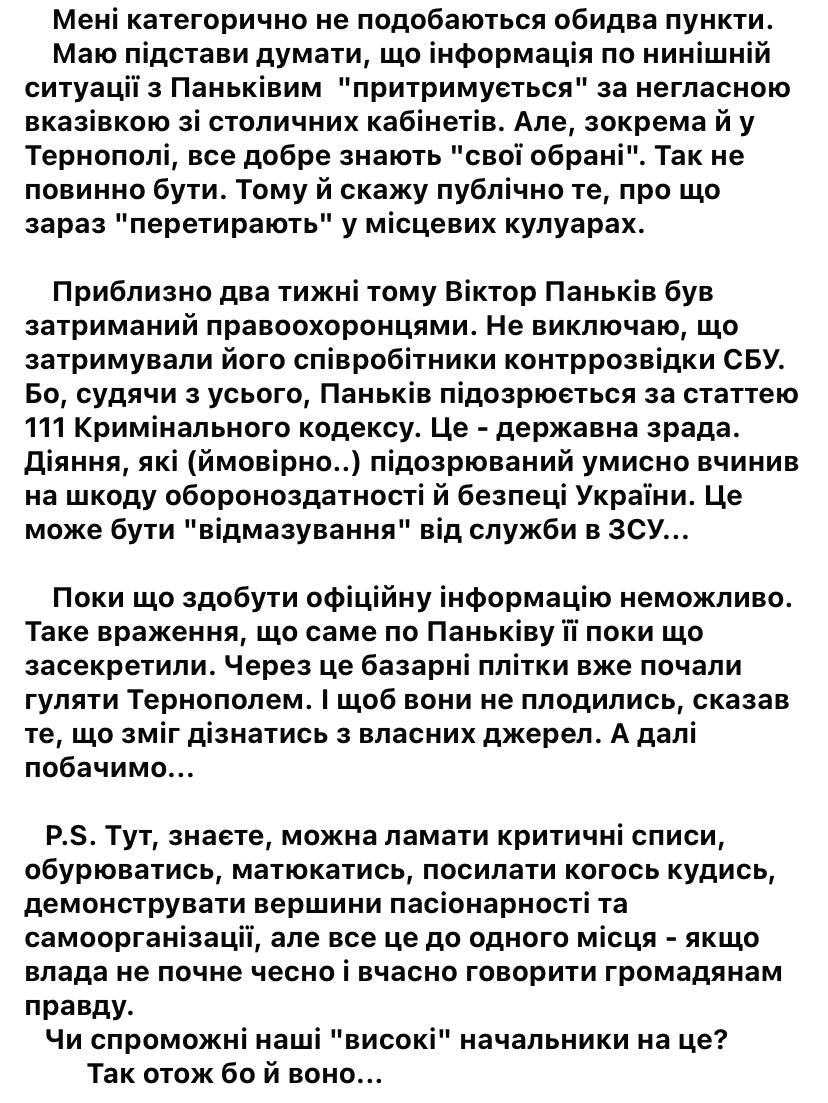 “Не виключаю, що затримували його співробітники контррозвідки СБУ. Бо, судячи з усього, Паньків підозрюється за статтею 111 Кримінального кодексу. Це — державна зрада. Діяння, які (ймовірно…) підозрюваний умисно вчинив на шкоду обороноздатності й безпеці України. Це може бути ‘відмазування’ від служби в ЗСУ…”, — написав Сінкевич.