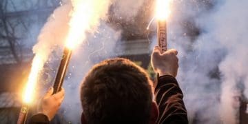 Фанати вирішили розважити присутніх яскравим шоу, повідомляє Т1 Новини. Вболівальники гостей запалили фаєри, так що над стадіоном піднявся чорний дим, а також понищили майно.
