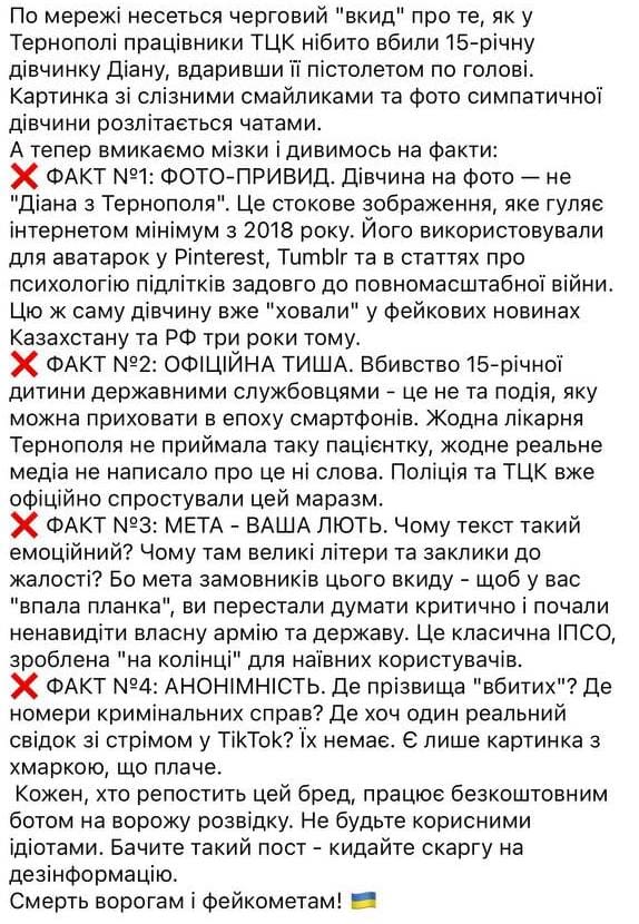 Історія про нібито смерть 15-річної дівчини на Тернопільщині після побиття працівниками ТЦК має всі ознаки інформаційно-психологічної операції, спрямованої на дискредитацію українських державних структур.