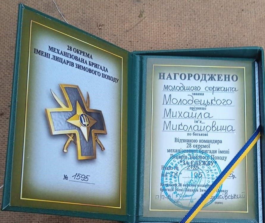 Молодший сержант Михайло Молодецький із села Постолівка Гусятинської громади на Тернопільщині удостоєний відзнаки «За службу». Її він отримав від командира 28-ї окремої механізованої бригади імені Лицарів Зимового Походу.