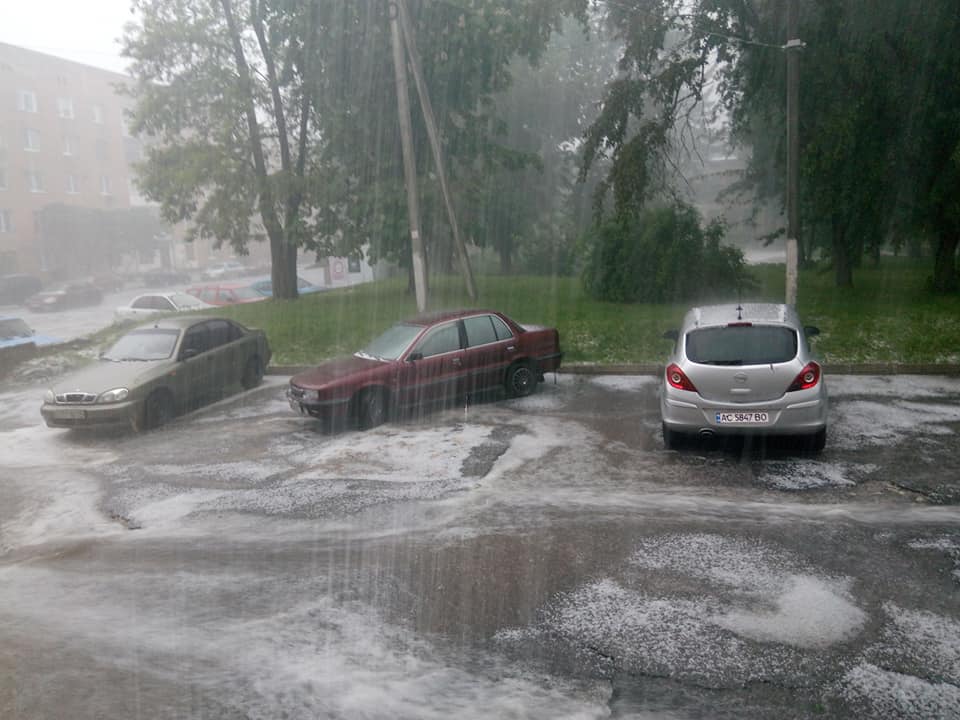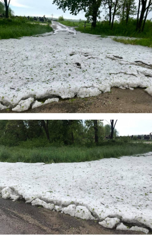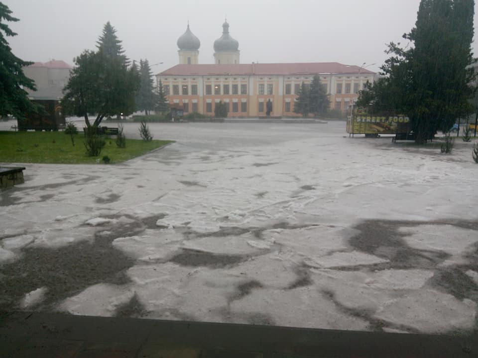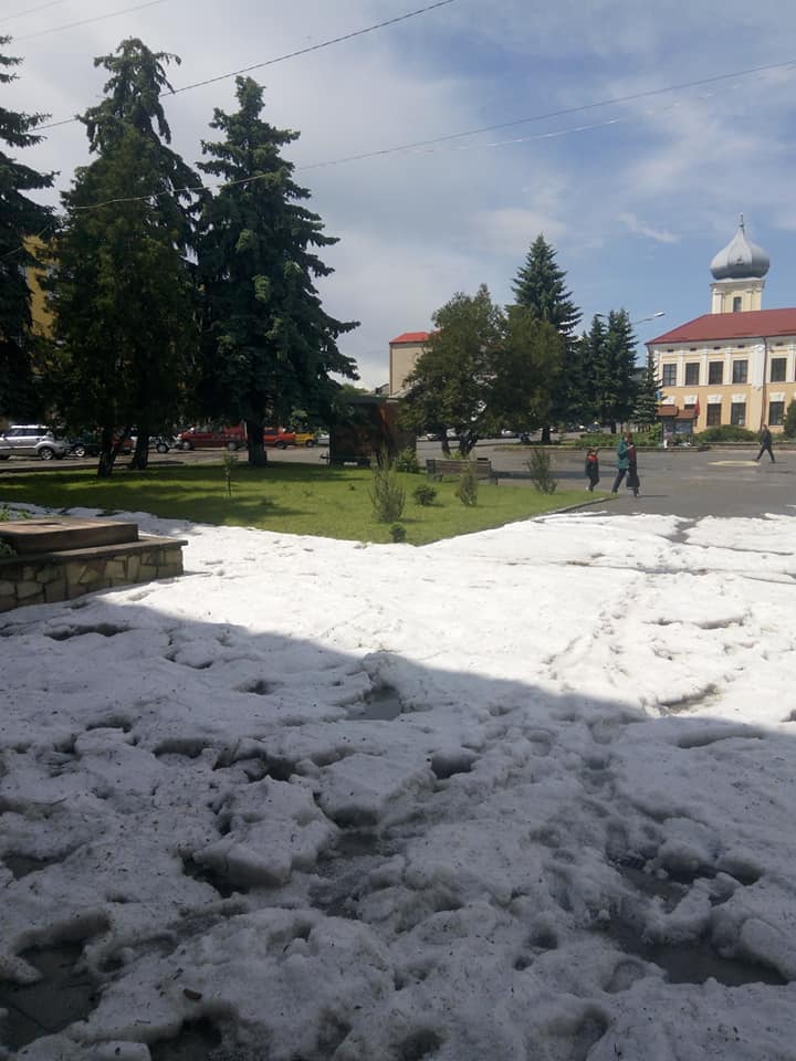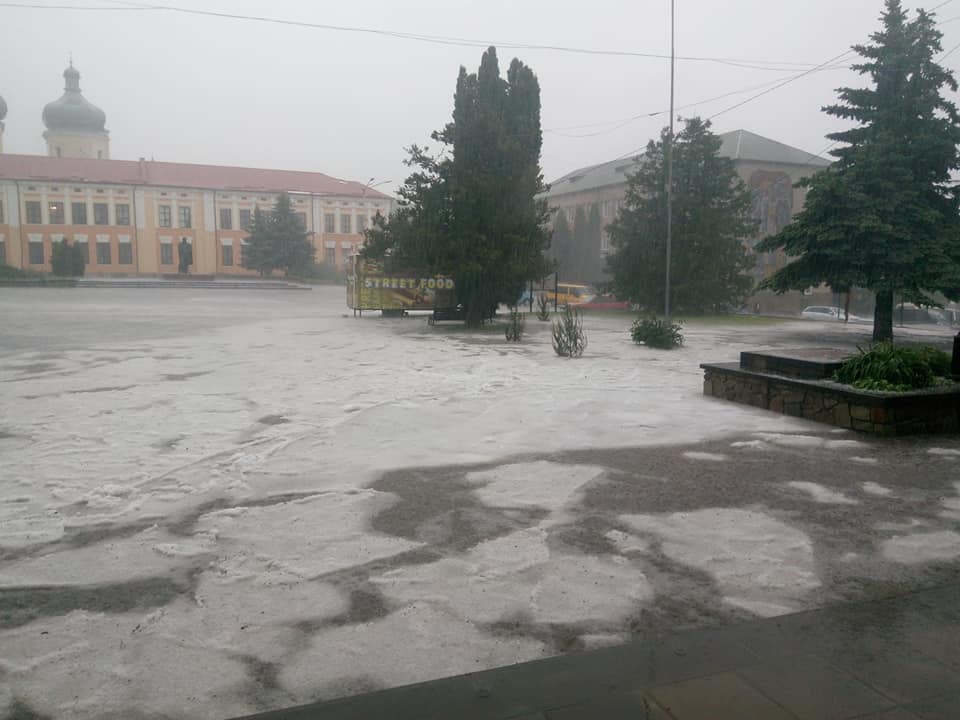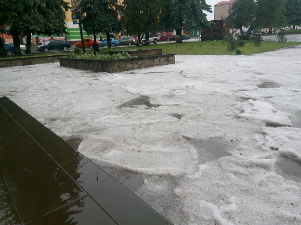 Близько обідньої пори в Збаражі, що на Тернопільщині, випав град. опади швидко залили вулиці міста, а на подвірях мешканців залишилися у вигляді снігу та льодинок.