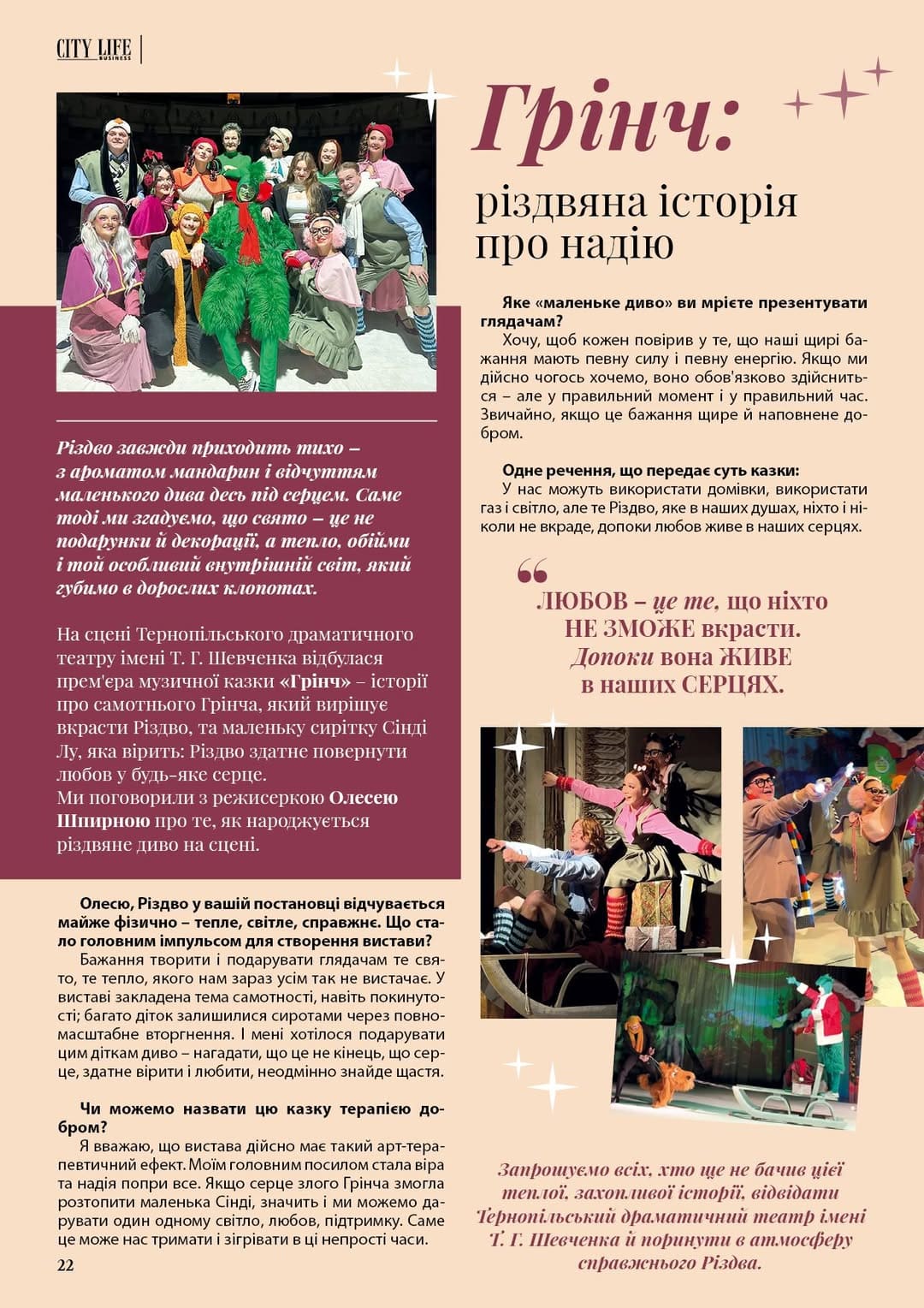 На сцені Тернопільського драматичного театру імені Т. Г. Шевченка відбулася прем’єра музичної казки “Грінч” — історії про самотнього Грінча, який вирішує вкрасти Різдво, та маленьку сирітку Сінді Лу, яка вірить: Різдво здатне повернути любов у будь-яке серце. Журнал “CITY LIFE” поговорив з режисеркою Олесею Шпирною про те, як народжується різдвяне диво на сцені.