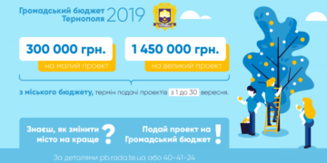 Прийом заявок на участь у конкурсу проектів «Громадський бюджет-2019» триває до 30 вересня. Кожен громадянин України, іноземець або особа без громадянства, яка має дозвіл на постійне проживання на території України та досягла 16-річного віку, може подати один великий (від 300 001 до 1 450 000 грн.) або один малий (до 300 000 грн.) проект загальноміського характеру.