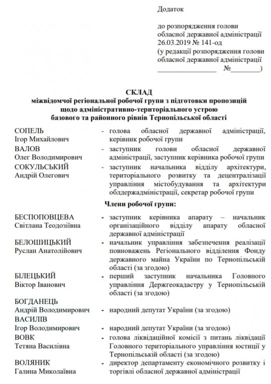 Голова Тернопільської обласної державної адміністрації Ігор Сопель сформував новий склад міжвідомчої регіональної робочої групи з підготовки пропозицій щодо адміністративно-територіального устрою базового та районного рівнів Тернопільської області.