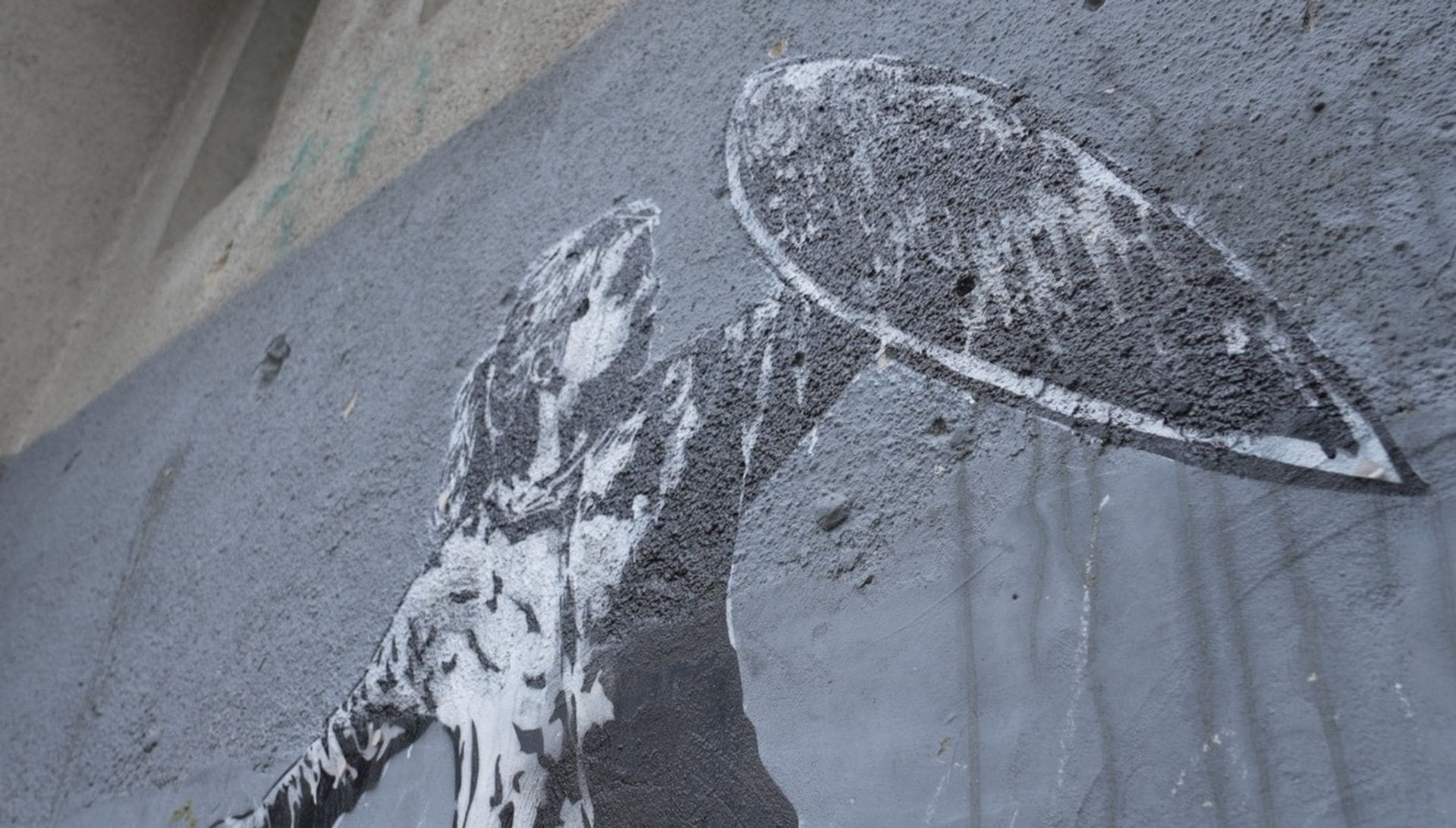 На стіні з’явилася маленька дівчинка зі щитом, яка закриває собою свої іграшки від ракети.