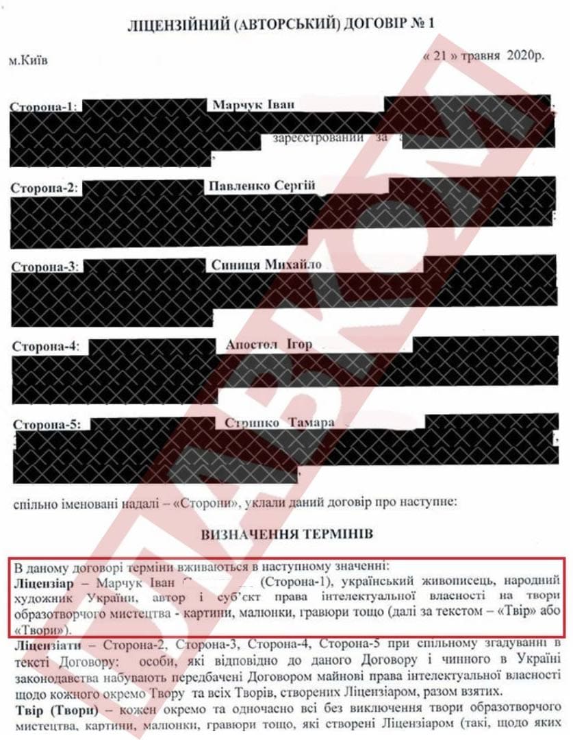 За даними «Главком», 21 травня 2020 року в Києві було підписано ліцензійний (авторський) договір за участю Івана Марчука, Сергія Павленка, Михайла Синиці, Ігоря Апостола та Тамари Стрипко. У ньому художник надав чотирьом особам виключну ліцензію на використання авторських прав на всі картини строком на 100 років із винагородою 10 тис. грн і 5% роялті. У тексті договору зазначено: