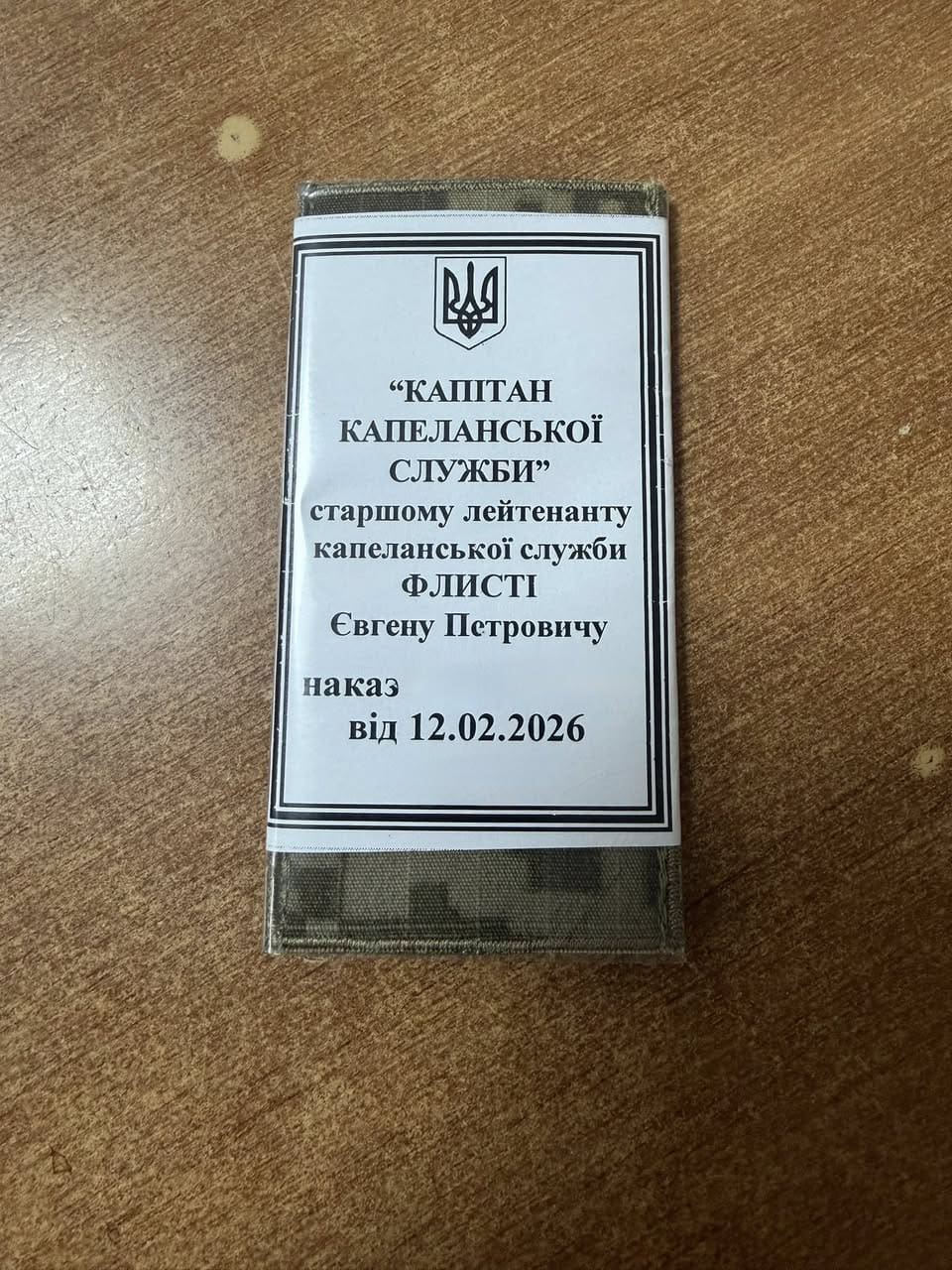 Відомий на Тернопільщині військовий капелан Євген Флиста повідомив про присвоєння йому чергового офіцерського звання — капітана капеланської служби. Для отця Євгена це стало ще одним підтвердженням важливості місії, яку він несе пліч-о-пліч із захисниками України.