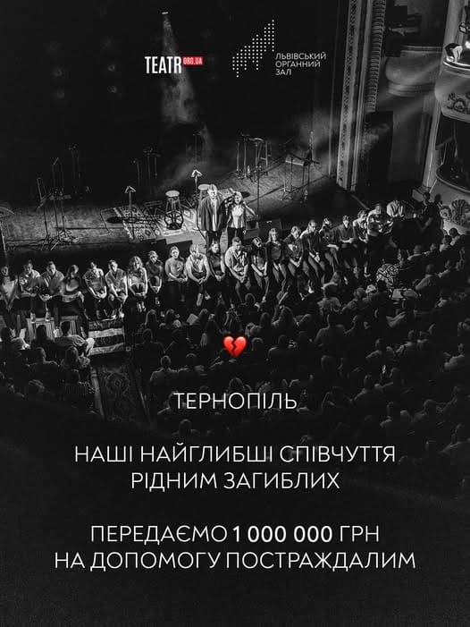 «TEATR.org.ua спільно з хором «Гомін» Львівського органного залу передають 1 000 000 грн на допомогу жертвам сьогоднішньої трагедії в Тернополі».