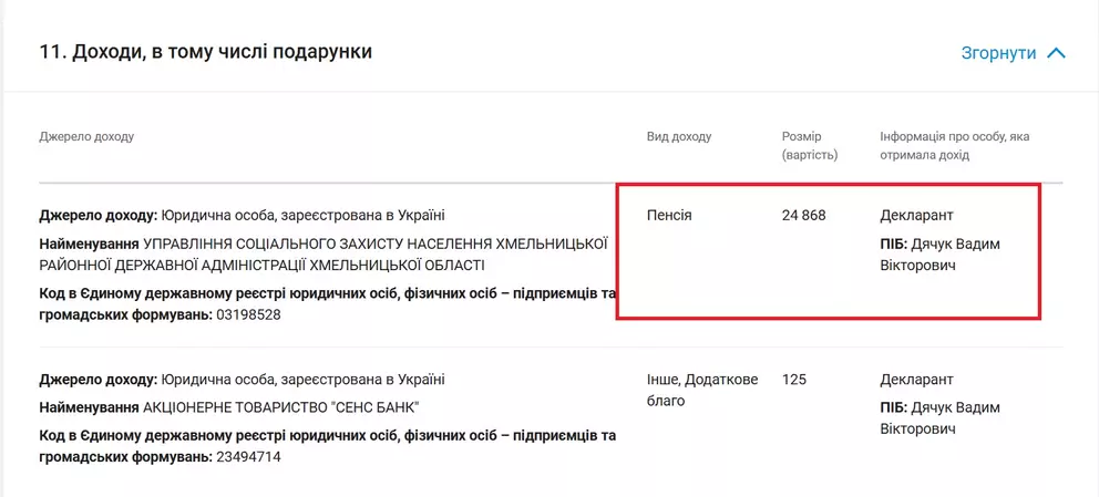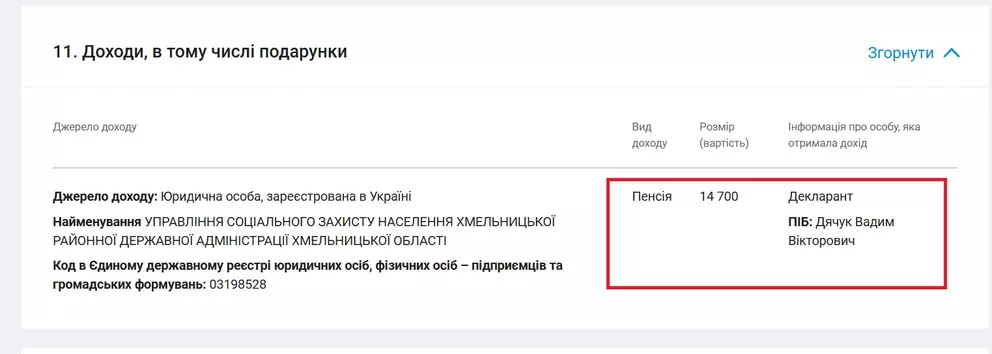 У дeкларації за 2023 рік пeнсії йому виплачували мeншe – 14 700 грн.