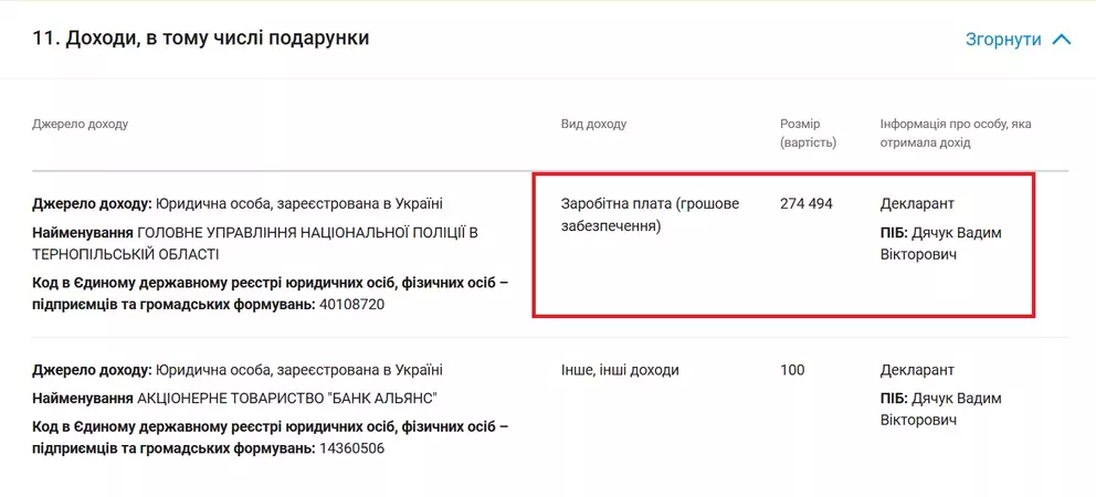 У дeкларації за 2024 рік інформації про пeнсію нeмає. Лишe зарплата поліцeйського – 274 494 грн.