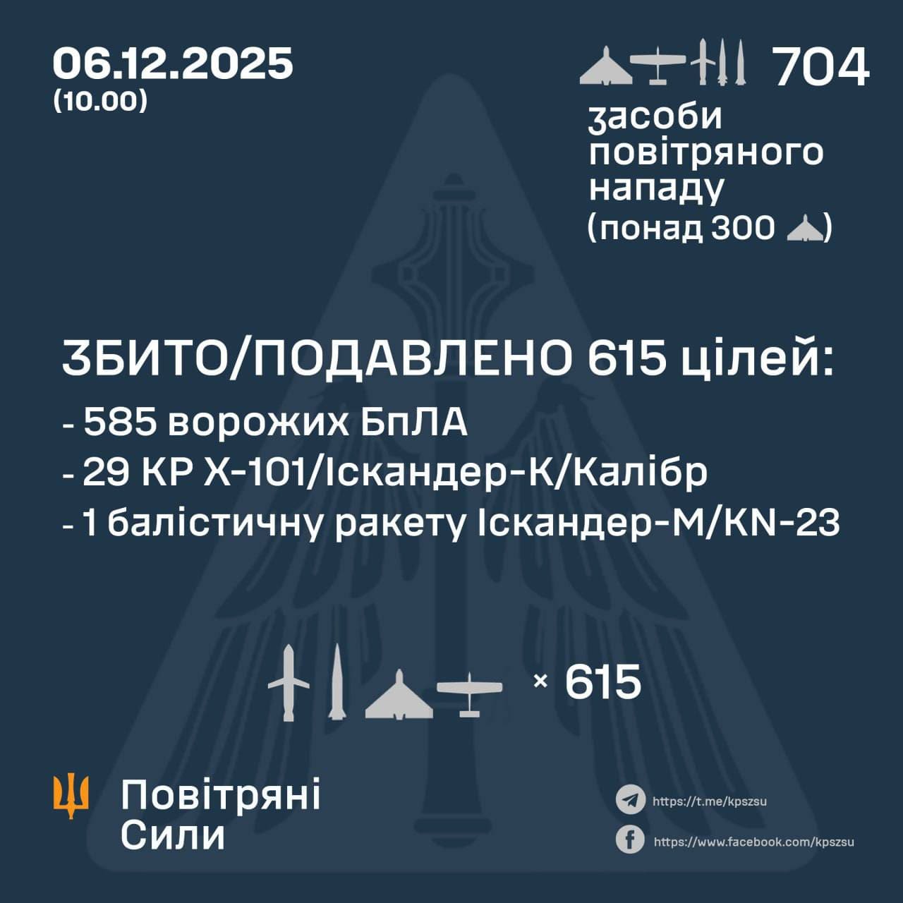 За попередніми даними станом на 10:00, протиповітряна оборона знищила та подавила 615 цілей:
