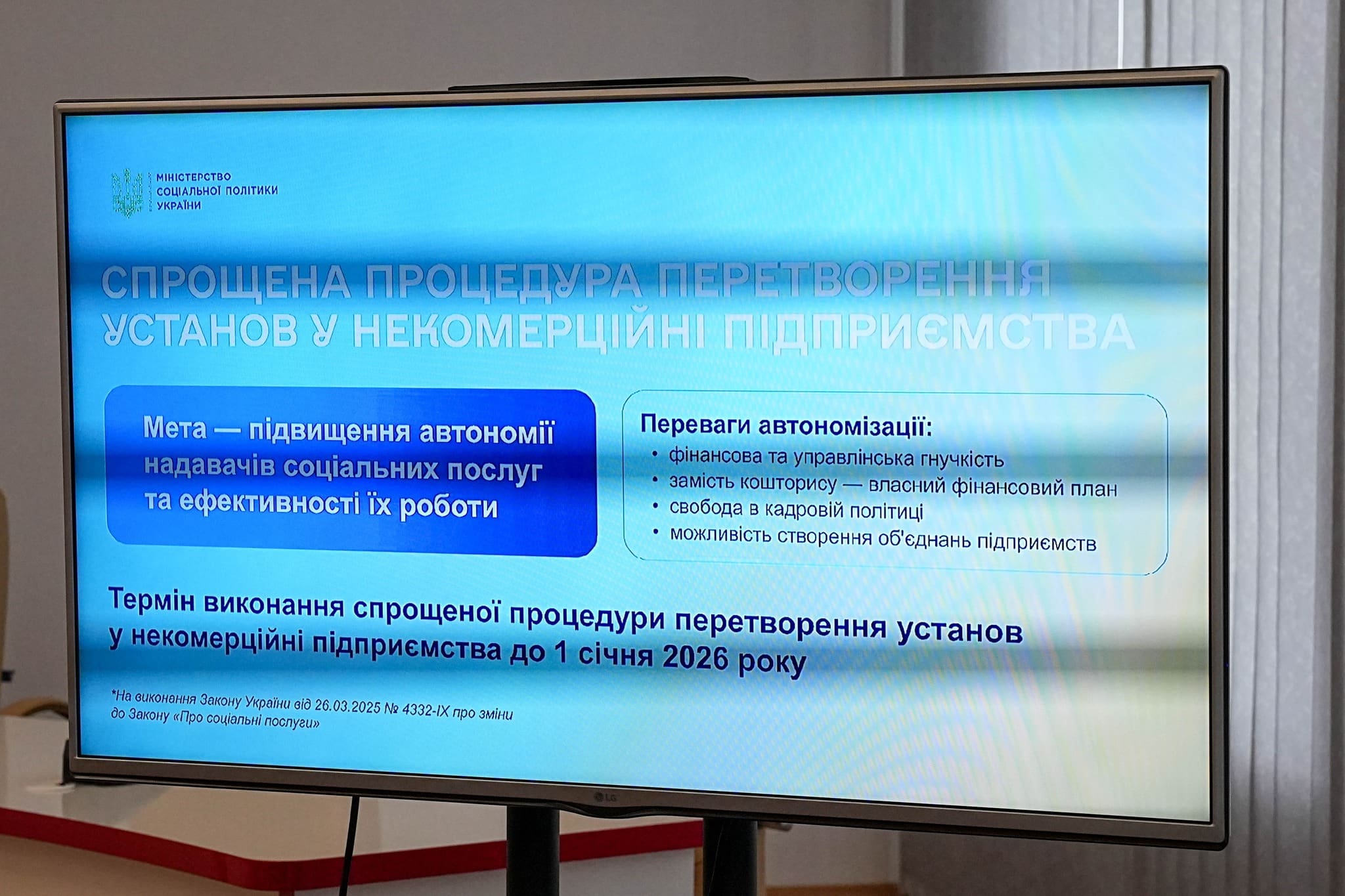 До 1 січня 2026 року всі установи соціального захисту в області мають бути перетворені на некомерційні підприємства. За словами міністерки, йдеться про підхід «гроші ходять за людиною». Для реалізації цього підходу місцевим радам та громадам потрібно ухвалити відповідні рішення.