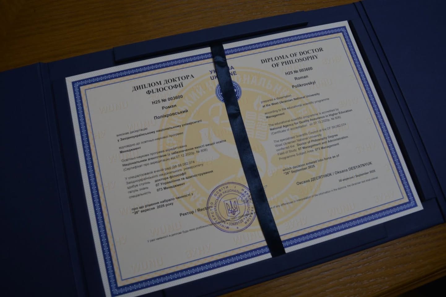 Міський голова Збаража Роман Полікровський здобув науковий ступінь доктора філософії (PhD) з менеджменту. Про це він повідомив у своєму Facebook 28 жовтня 2025 року.