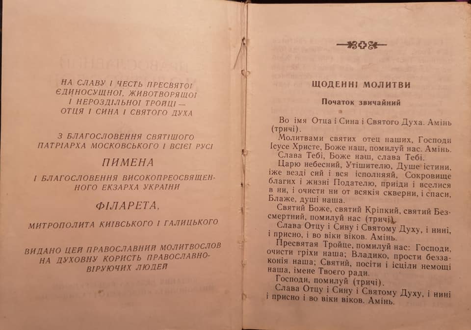Священик Віталій Кравець, уродженець Тернопільщини, який нині мешкає у Празі (Чехія), у своєму дописі в соціальній мережі поділився цікавою думкою та світлинами. Отець показує, що перші переклади православного молитовника українською мовою в сучасній історії Церкви були надруковані з благословіння патріарха Філарета, ще коли він був у сані митрополита Київського. Зауважимо, що досі УПЦ Московського Патріархату (РПЦ в Україні) не має власної богослужбової літератури рідною, українською мовою.