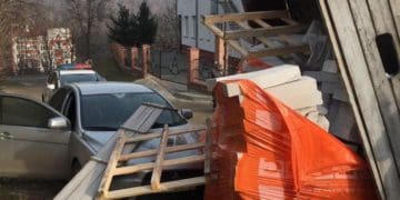 Чоловік переплутав важелі, та замість того, щоб здійснити рух заднім ходом — натиснув важіль підйому кузова, розвантаживши будматеріали на автомобіль Mitsubishi. На щастя, ніхто не постраждав.