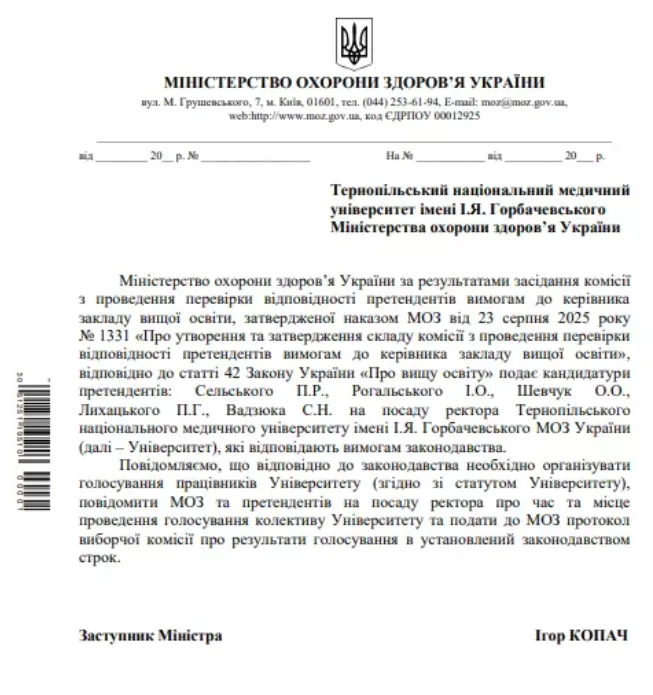 – Міністерство охорони здоров’я України за результатами засідання комісії з проведення перевірки відповідності претендентів вимогам до керівника закладу вищої освіти, затвердженої наказом МОЗ від 23 серпня 2025 року № 1331 «Про утворення та затвердження складу комісії з проведення перевірки відповідності претендентів вимогам до керівника закладу вищої освіти», відповідно до статті 42 Закону України «Про вищу освіту» подає кандидатури претендентів на посаду ректора Тернопільського національного медичного університету імені І.Я. Горбачевського МОЗ України (далі – Університет), які відповідають вимогам законодавства: