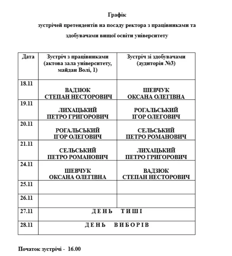 Нагадаємо, вибори ректора ТНМУ мають відбутися 28 листопада. До 24 листопада клопотання про реєстрацію можуть подати громадські спостерігачі та представники ЗМІ. 27 листопада оголошений Днем тиші.