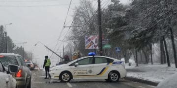 У Тернополі на проспекті С. Бандери вранці було важко проїхати, адже вночі водій збив електроопору, що заважає руху транспорту.