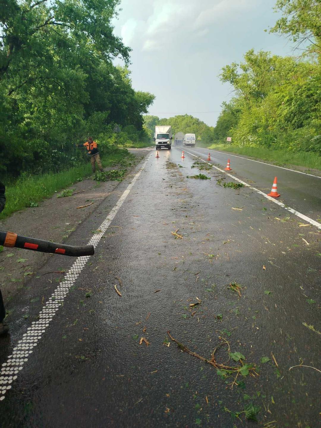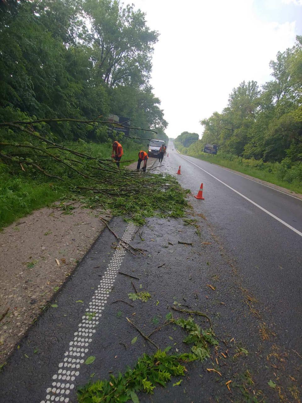 На дорогах області працівники Служби відновлення та розвитку інфраструктури розчищають проїзди від намулу, гілля та повалених дерев. За інформацією зі сторінки Служби у соцмережі, рух транспорту на дорогах державного значення вдалося зберегти.