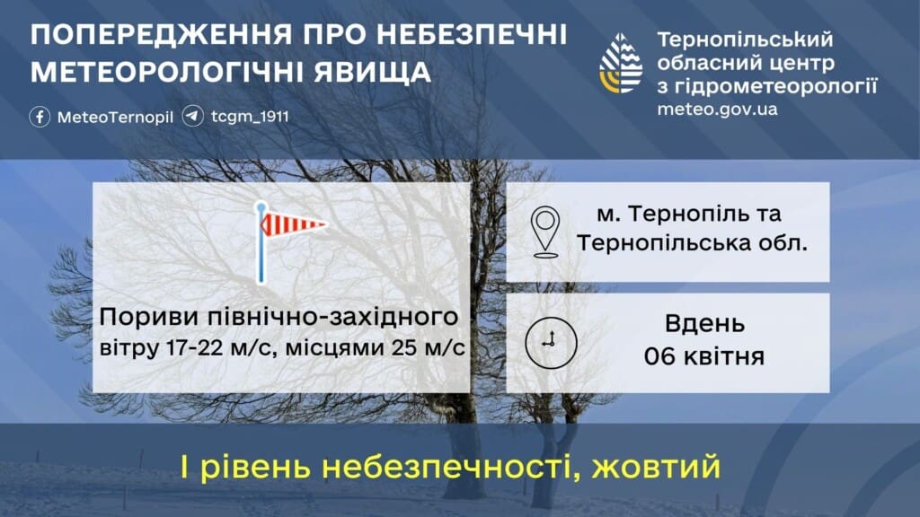 - Область: 6 квітня вдень пориви північно – західного вітру 17 – 22 м/с, місцями 25 м/с.