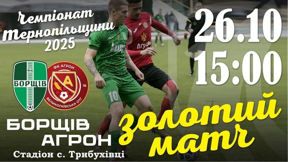 26 жовтня на стадіоні в селі Трибухівці Чортківського району відбудеться «золотий матч» чемпіонату Тернопільської області з футболу сезону 2025 року. За головний трофей змагатимуться ФК «Борщів» та ФК «Агрон» з Великогаївської громади. Початок гри – о 15:00.