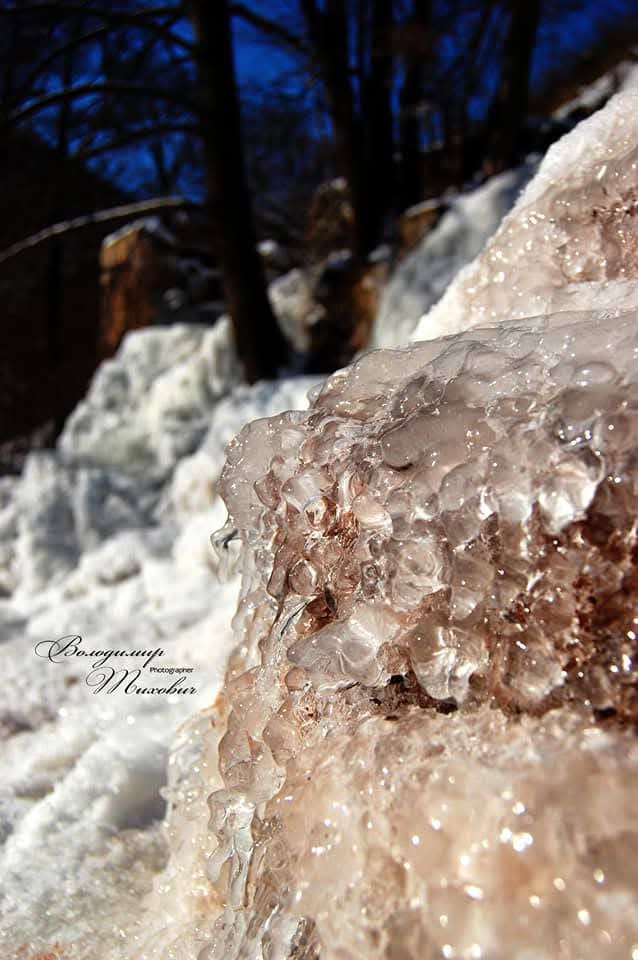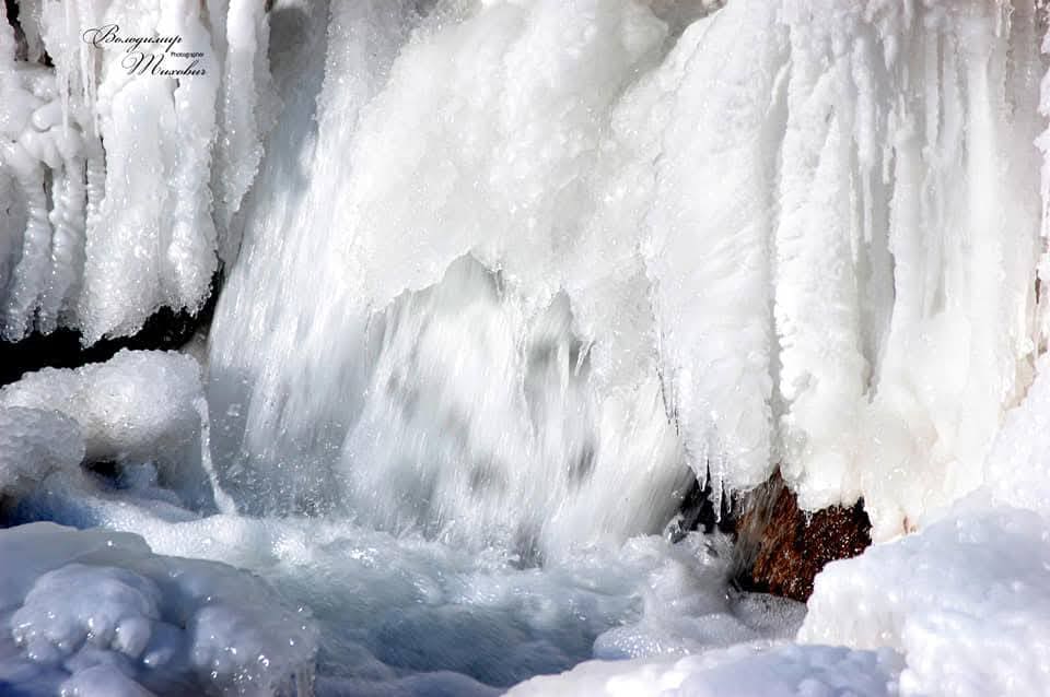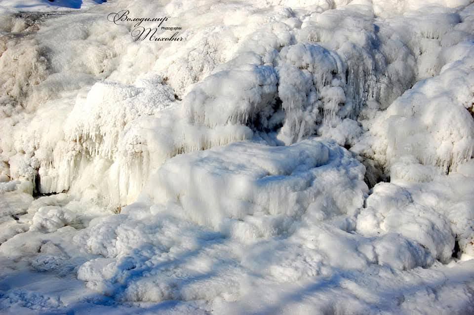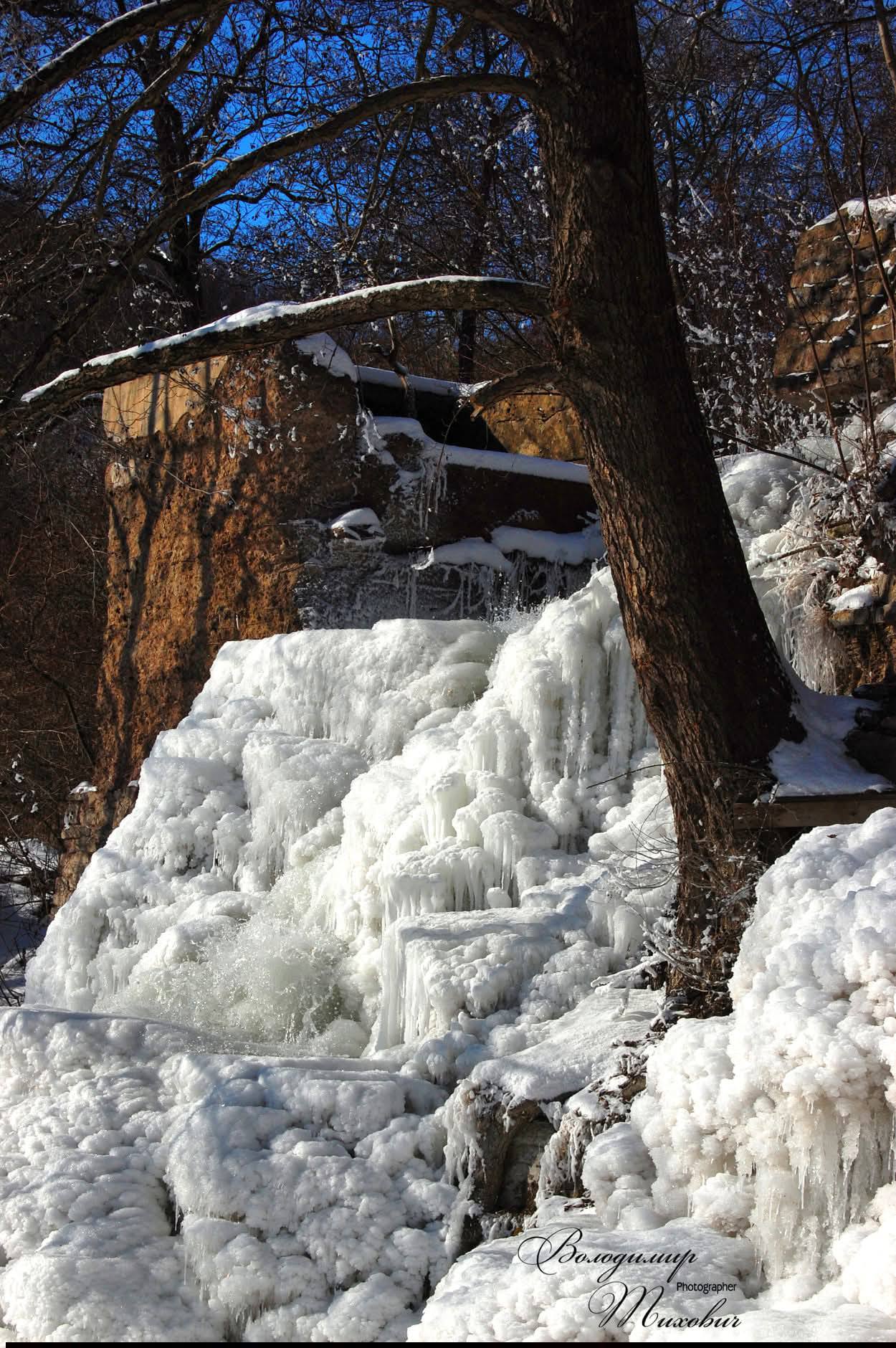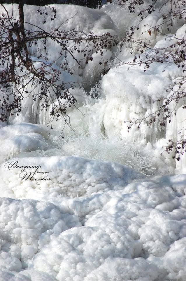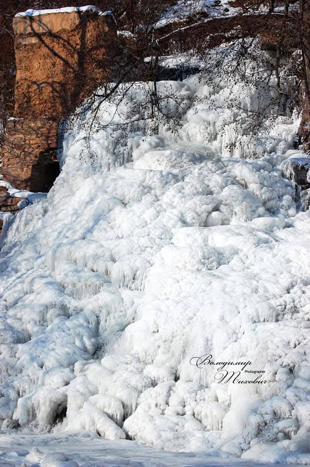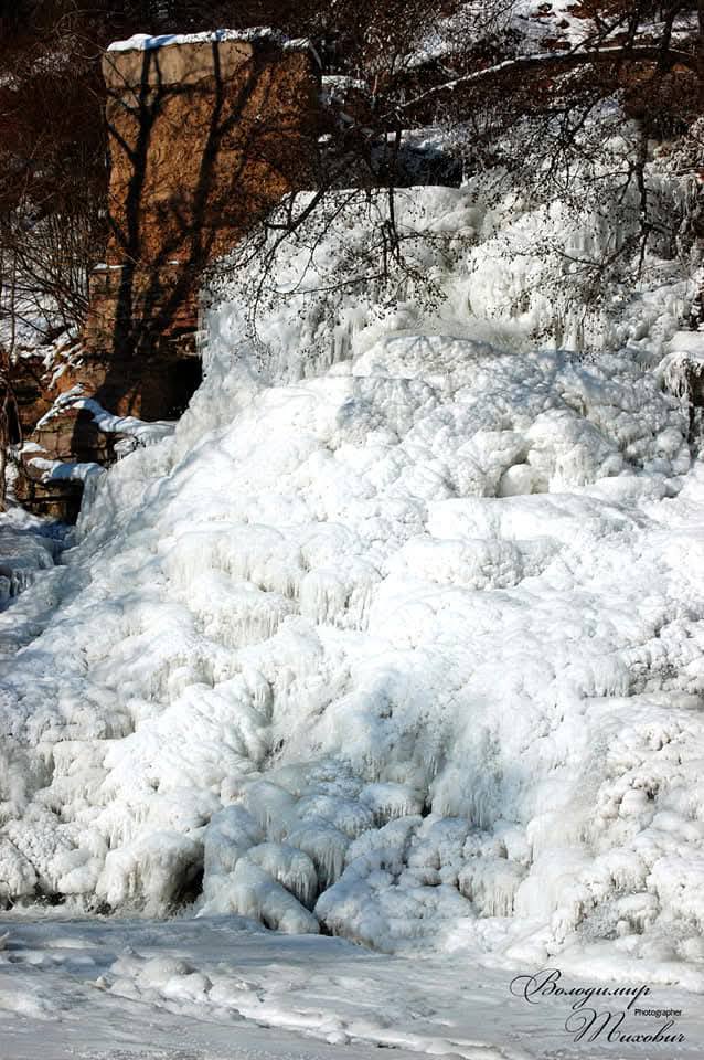 Через тривалі морози потужні потоки води скувалися льодом. Каскади, якими зазвичай із шумом спадає вода, перетворилися на крижану стіну. Навіть у замерзлому стані водоспад зберігає свою масштабність і добре помітний здалеку.