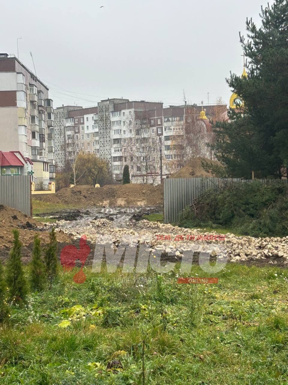 На місці вже вирито котлован. Територія обнесена огорожею, а на ділянці видно техніку та сліди активних земляних робіт. Будівництво пов’язане з потребою облаштування каплиці, де проводитимуть прощання.