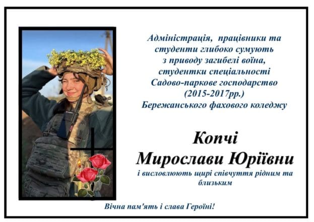 Про це повідомили в добровольчій розвідувальній БПАК групі «Баракуда», де служили полегліпише ПЕРШИЙ Онлайн. Також загибель Мирослави підтвердили в Бережанському фаховому коледжі НУБІП України, де вона навчалася з 2015 по 2017 рр. по спеціальності Садово-паркове господарство.