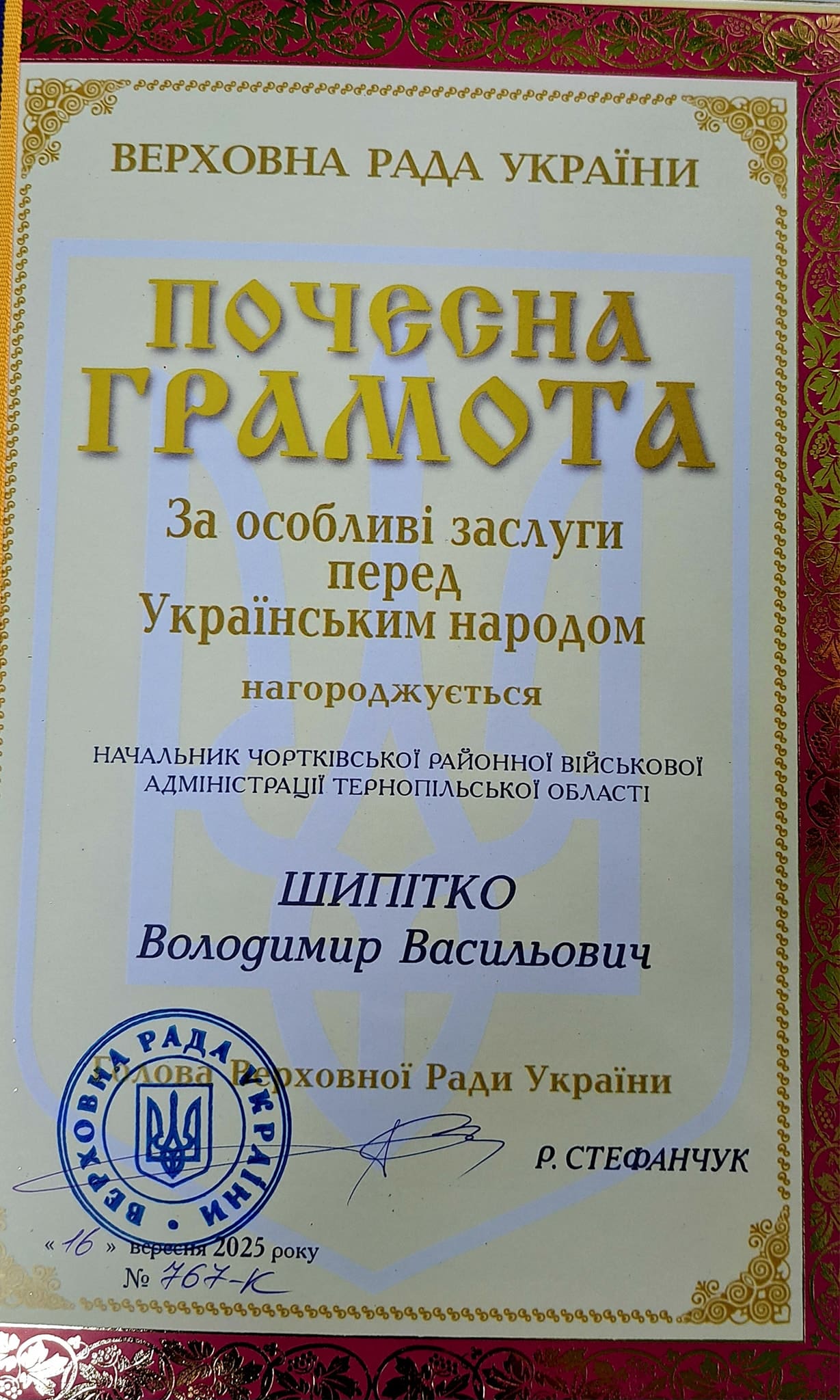 Начальника Чортківської районної військової адміністрації Володимира Шипітка відзначили найвищою нагородою парламенту – Почесною грамотою Верховної Ради України «За особливі заслуги перед Українським народом». Ця відзнака стала визнанням його внеску в зміцнення обороноздатності регіону та підтримку Збройних Сил України в умовах повномасштабної війни.