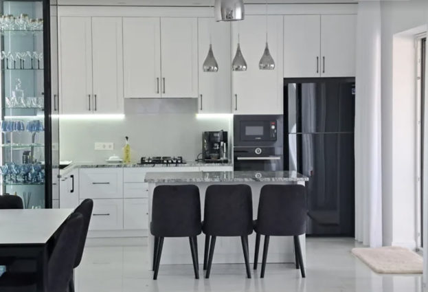 Інтер’єр виконаний зі смаком: високоякісні меблі з дерева, сучасна побутова техніка та дорога сантехніка.