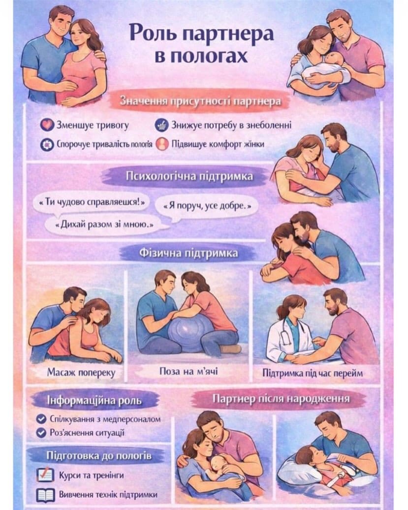«Важливо, щоб партнер не панікував і не передавав свій страх жінці. Правильно підготовлений партнер — це спокій, безпека і позитивний досвід пологів», — підкреслює Тетяна Небесьо.