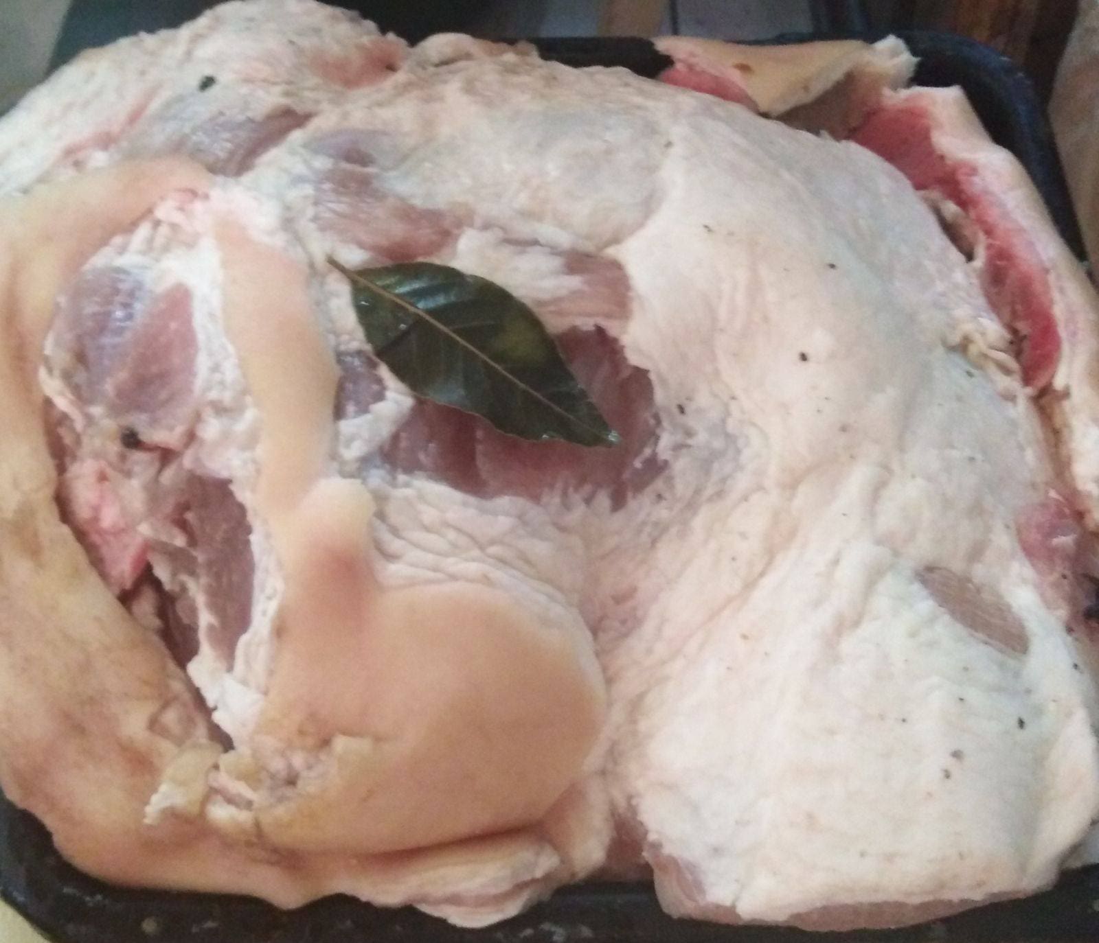 Маринуємо цілу лопатку так, як шинку: на 1 літр води − 1 склянка (250 грамів) солі, 1 столова ложка цукру, 3−5 лаврових листочки, 10 горошин перцю. То старий рецепт маринаду. Зараз мама ще додає 2 горошини запашного перцю і 2 цвяшки гвоздики. На лопатку треба 3−5 літрів маринаду. Варимо сироп (кип’ятимо 5−10 хвилин).