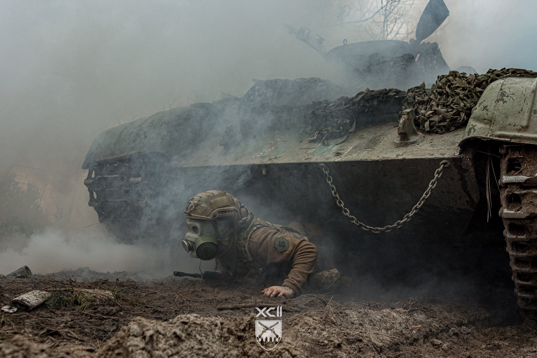 Рекрути мають пролізти під заведеною машиною, коли навколо лунають вибухи і валить дим — тому виконують це завдання у протигазах. Наступна вправа — стрибнути в окоп, коли на тебе рухається бронетехніка, а після того як вона проїде — вискочити і виконати імітацію пострілу з гранатомета.