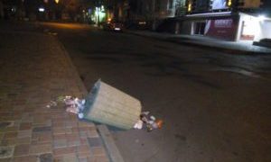 Один з смітників хулігани викотили на дорогу, де він розвалився разом із вмістом. Частину сміття залишили розкиданим на тротуарі. Все це – поруч із церквою Різдва Христового і не так вже й далеко від управління національної поліції.