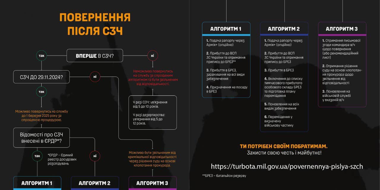 Для тих, хто залишив частину пiсля 29 листопада 2024 року, дiє iнша процедура. Спочатку вiйськовослужбовець повинен отримати письмову згоду вiд командира частини або батальйону резерву. Далi проводяться всi необхiднi слiдчi та процесуальнi дiї в рамках вiдкритого кримiнального провадження за фактом СЗЧ. Пiсля цього суд ухвалює рiшення про звiльнення вiд кримiнальної вiдповiдальностi за клопотанням прокурора, що дозволяє вiйськовослужбовцю поновитися на службi та отримати забезпечення. Цi процедури стосуються лише вiйськовослужбовцiв, якi вчинили СЗЧ вперше.