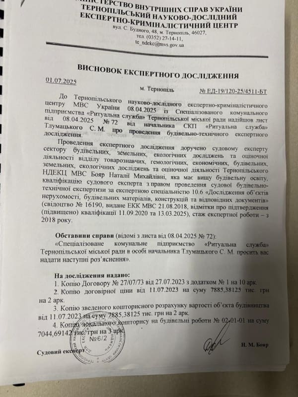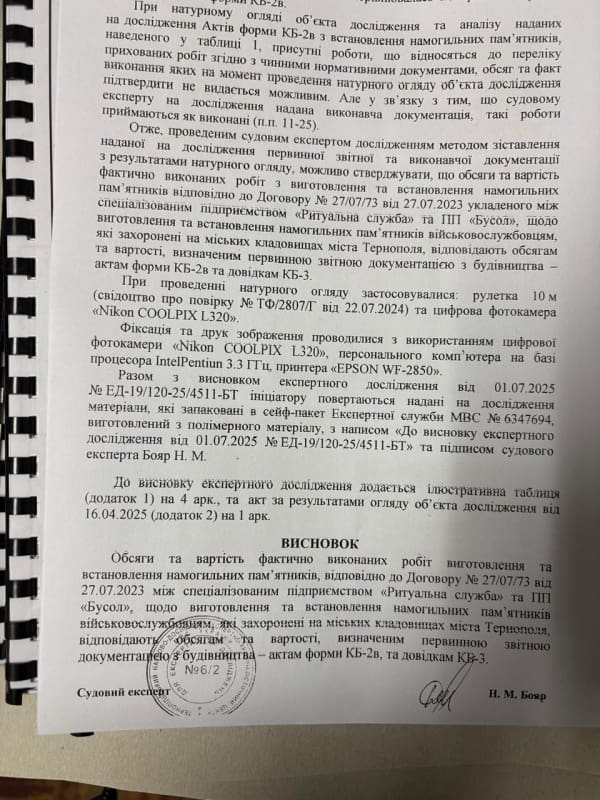 01.07.2025 Тернопільським науково-дослідним експертно-криміналістичним центром надано висновок експертного дослідження у якому констатовано про те, що обсяги та вартість фактично виконаних робіт виготовлення та встановлення намогильних пам’ятників відповідно до Договору №27/07/23 від 27.07.2023 між СКП «Ритуальна служба» та ПП «Бусол» відповідають обсягам та вартості, визначеним первинною звітною документацією з будівництва – актам форми КБ-2в та довідкам КВ-3.